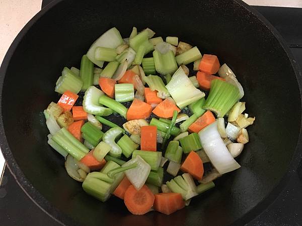 在另一個鍋中加熱橄欖油,加入紅蘿蔔、芹菜、洋蔥、蒜頭略炒