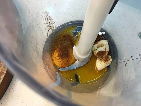 蒜頭,蛋黃,辣椒粉放進攪拌機攪拌,攪拌中不時加入橄欖油,最後在加入糖,鹽,檸檬汁