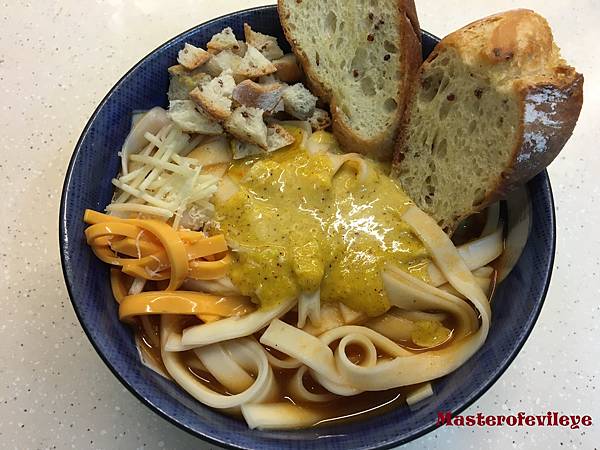 將麵,乳酪絲,麵包丁,麵包脆餅放入湯碗裡,法式魚湯拉麵完成