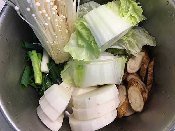 白蘿蔔洗淨去皮切塊;包心白菜洗淨切片,其他蔬菜吧啦吧啦......