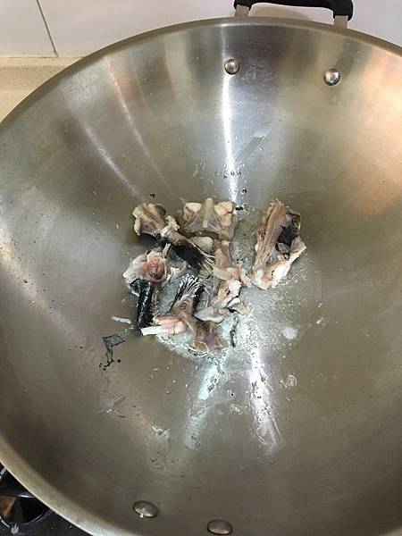 熱鍋倒入少許油燒熱,放入汆燙的魚骨,魚鰭以大火略炒