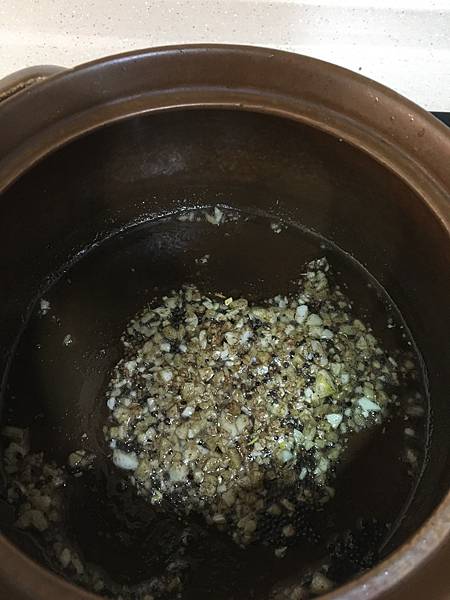 取砂鍋倒入油加熱,芥末子、小茴香、生薑、大蒜放入鍋中炒出香氣