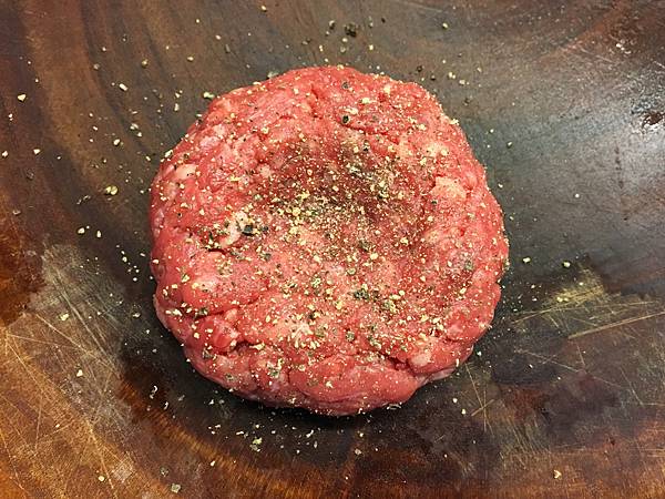 牛絞肉做成漢堡,撒上黑胡椒和鹽