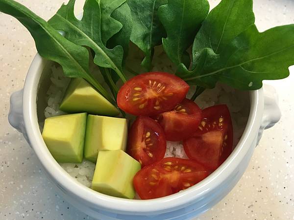 碗內盛飯放上切丁的酪梨、番茄、配菜我選芝麻菜