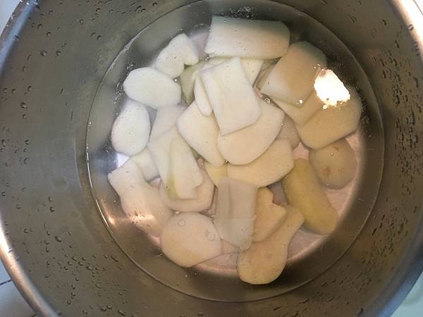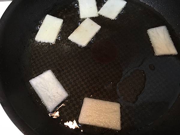 馬鈴薯切片,用大量的油下鍋煎炸至酥脆