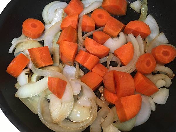 把洋蔥炒至褐色,切塊紅蘿蔔下鍋略炒