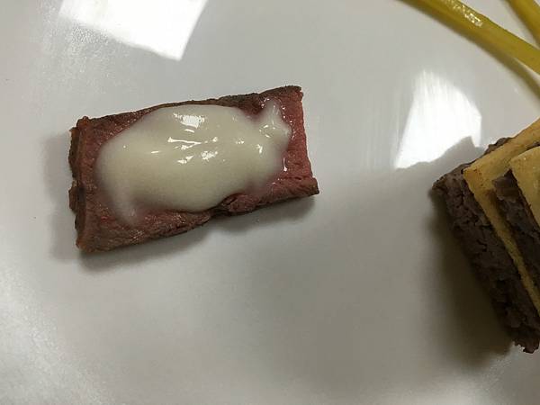 切片牛肉修整成和薯片相同大小,抹上薯泥再放一片牛肉
