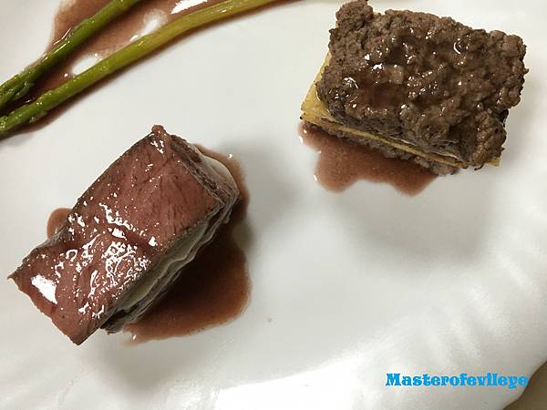 淋上醬汁(煎過的鍋子加入燉煮的湯汁,紅酒,葡萄酒醋,熬煮成醬汁)