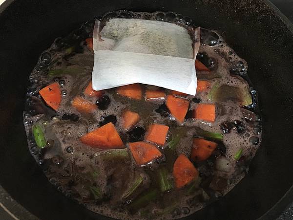倒入紅酒攪拌,加水放入胡椒粒,鹽及香料包