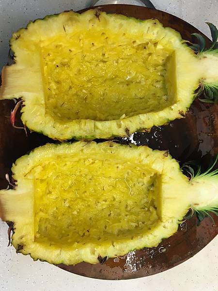鳳梨烤好後會出水,把火雞肉移到另一邊的上蓋,將下層的果汁倒入鍋中混拌