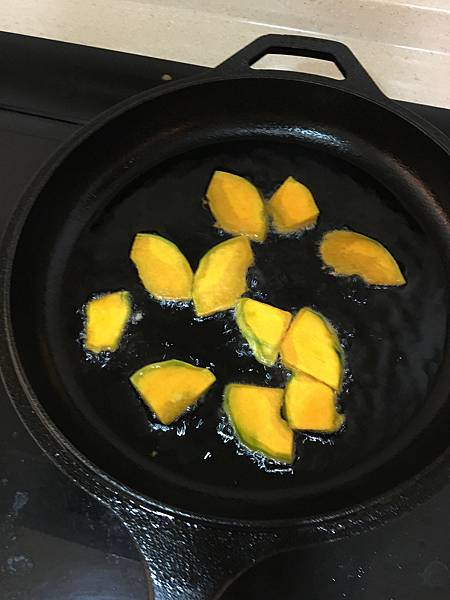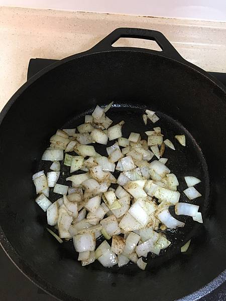 洋蔥用麵粉混拌,放入鍋中炒熟