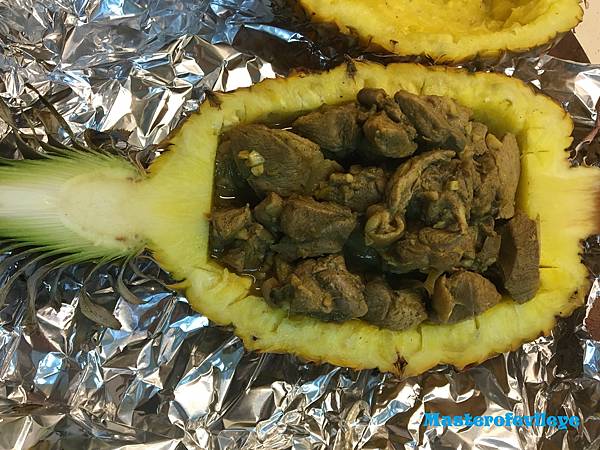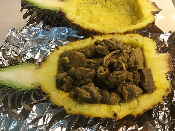 鳳梨放入火雞肉蓋起來進入烤箱中烤
