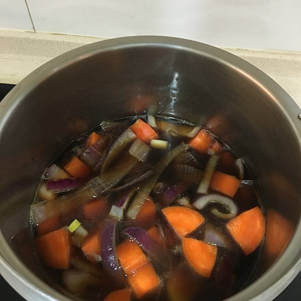 放入鍋中加水,加入調味料(醬油2大匙,蠔油1大匙,酒1大匙,味霖1大匙,糖1大匙) 燉煮