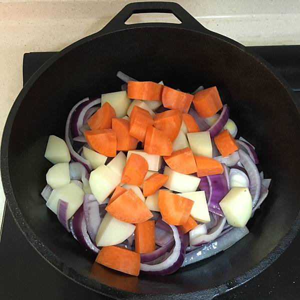 切塊紅蘿蔔 、馬鈴薯下鍋略炒
