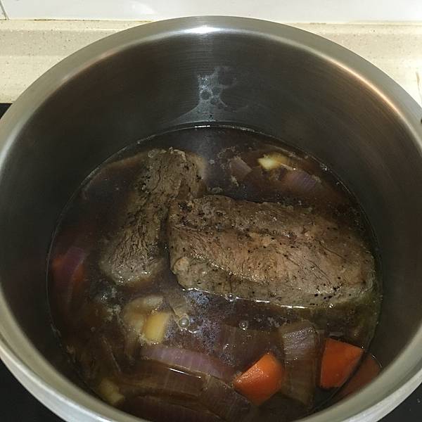 放入鍋中用文火燉煮4~5分鐘(視牛排的大小而定)