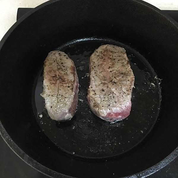 里肌牛排撒上黑胡椒,鹽先將表面煎熟