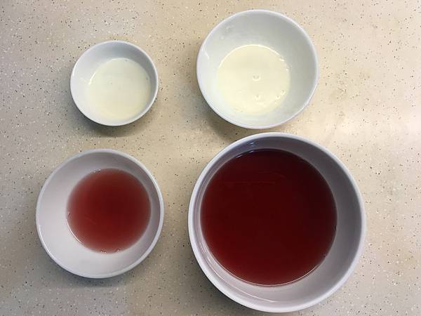 吉利丁粉加入水融化,倒入蔓越莓汁混和均勻 ,倒進模具1/3的量放入冰箱冷藏。