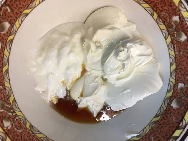 馬斯卡彭起司加入楓糖、優格、 鮮奶油拌勻,再將融化的吉利丁倒入起司糊裡混和。