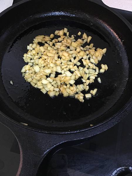 3.用奶油將蘋果丁下鍋翻炒,可依個人喜好煮至半透明狀或軟爛。