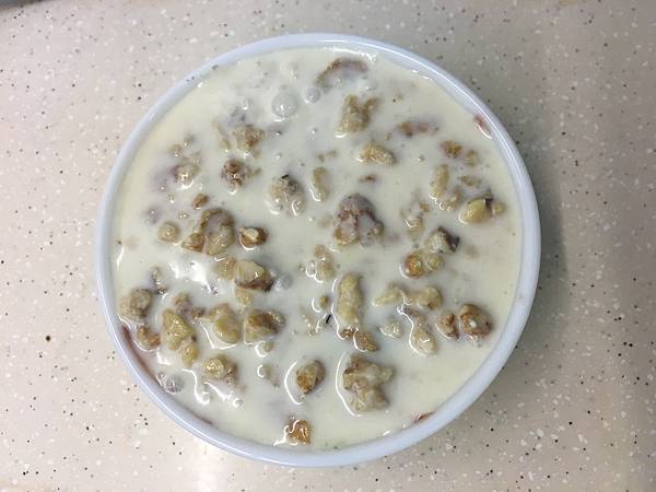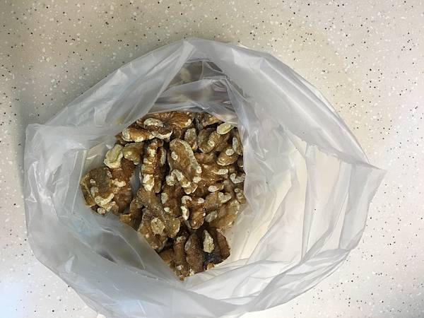 核桃放在塑膠袋裡面用桿麵棍壓碎+起司慕斯混和