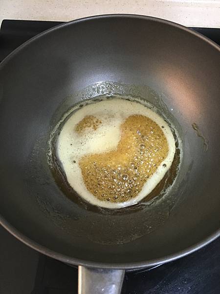 將砂糖倒在鍋中加熱,轉化成焦糖色後倒在烘培紙上弄成自己喜歡的樣子