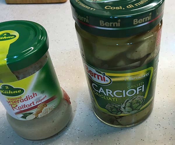 買不到新鮮的朝鮮薊、辣根(西洋山葵)只好買罐裝的,進口超市賣的不便宜啊