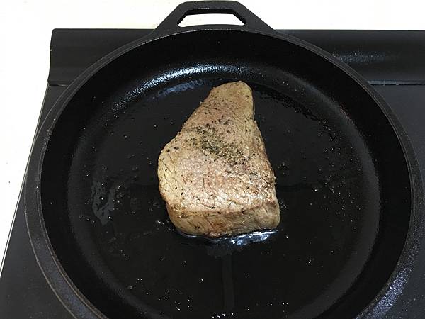菲力牛肉撒上鹽、黑胡椒,下鍋將表面煎熟,再送進烤箱烤