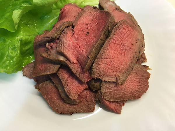 盤中放入生菜,將烤好靜置過的牛肉切成薄片推疊成山