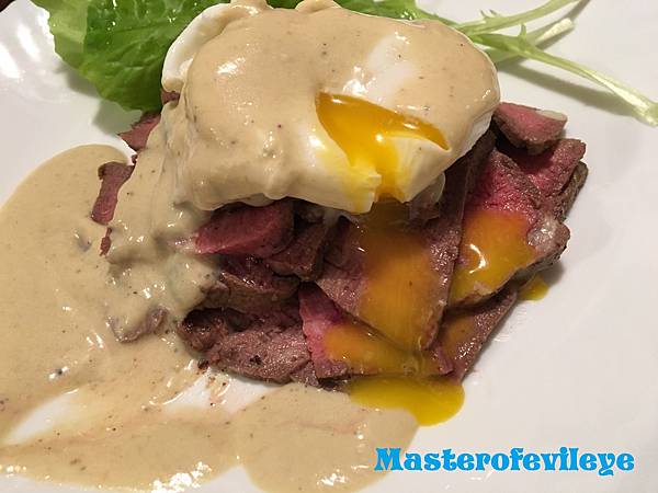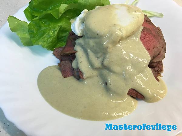 擺上煮好的水波蛋,淋上過濾的奶油白醬,魅惑的烤牛肉就完成了![]()