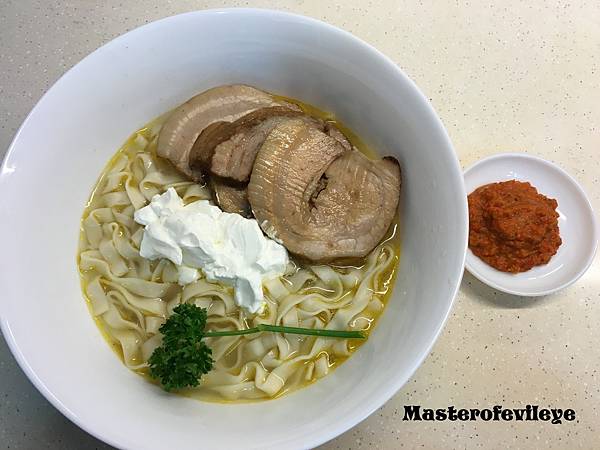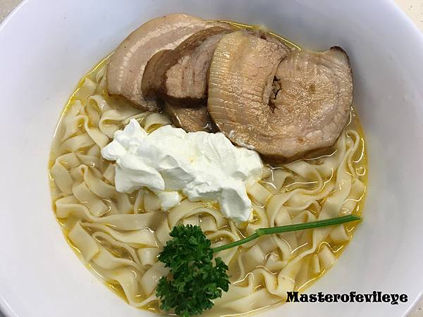 高湯過濾,放入厚切的叉燒、酸奶油、巴西利,非洲拉麵就完成了