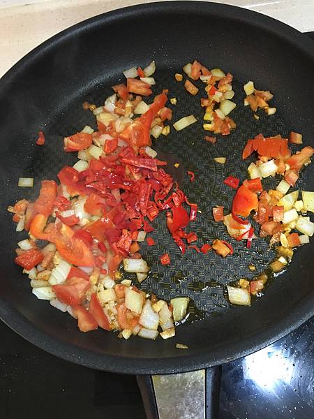 平底鍋熱油中火炒洋蔥末、蒜末、紅椒末、辣椒末、番茄碎末約5分鐘至有點焦糖化