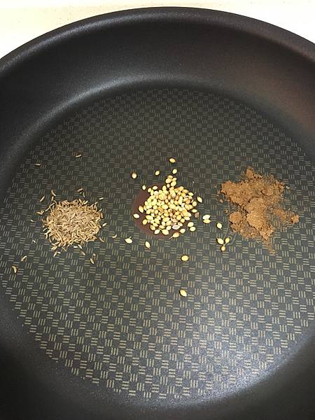 平底鍋小火乾炒芫荽籽、葛縷子籽、小茴香2分鐘