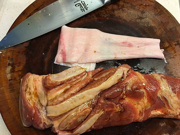 五花肉去皮,由於是有時間限制的比賽,所以將五花肉內側塗上醬料[大蒜、醬油、酒、砂糖]