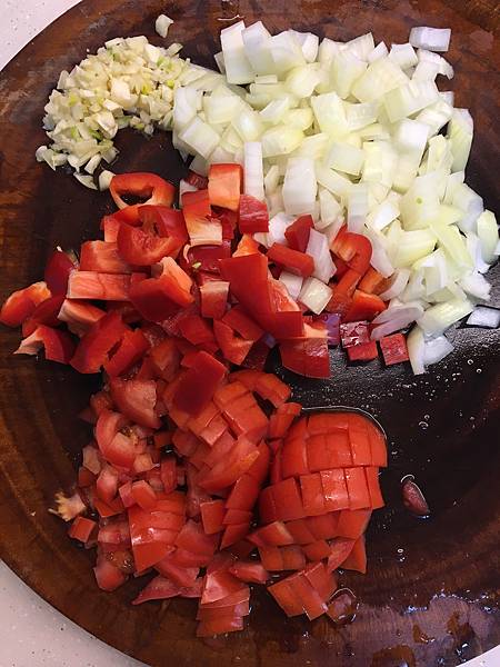 紅彩椒、大蒜、洋蔥、番茄切碎