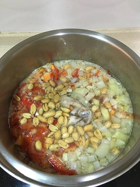 蔬菜和花生加入鍋中熬煮,最後再用胡椒、鹽調味