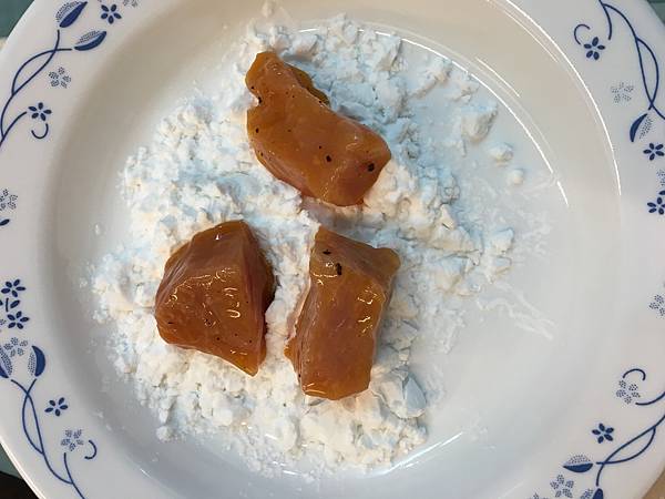 里脊肉切成一口大小的塊狀,用鹽、糖、黑胡椒、雞蛋黃攪拌均勻以後,裹上太白粉