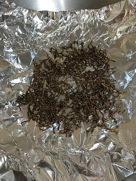 炒鍋鋪鋁箔紙放入綠茶葉,茶葉用普通的茶葉就行了