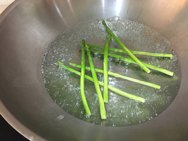 蘆筍刨去根部較粗的部分,放進加鹽的水煮過,再放進冰水中
