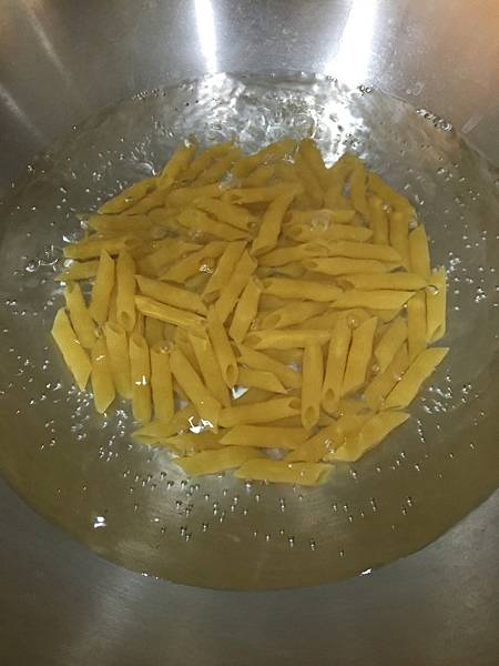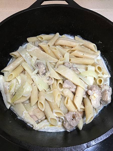 加入水、牛奶、筆管麵燉煮,撒點鹽、黑胡椒調味