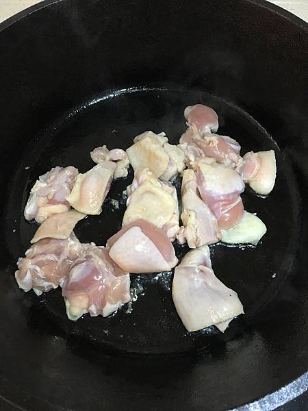 雞腿肉切塊放進鍋中炒,再依序放入洋蔥、竹筍