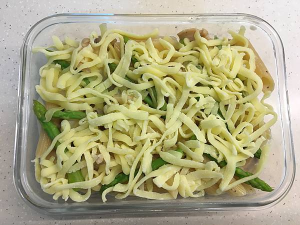 將材料放進耐熱皿中,撒上乳酪絲和少許麵包粉進烤箱烤