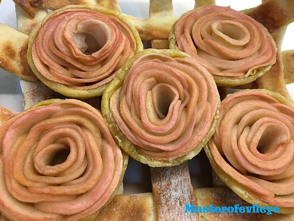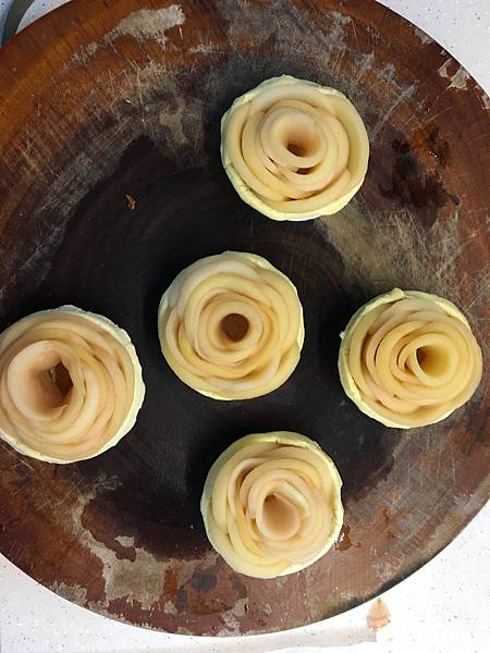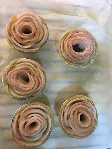 塔皮底部用叉子戳洞放進切薄的蘋果片,依圖的順時針方向層層做成玫瑰花,完成後放進烤箱烤