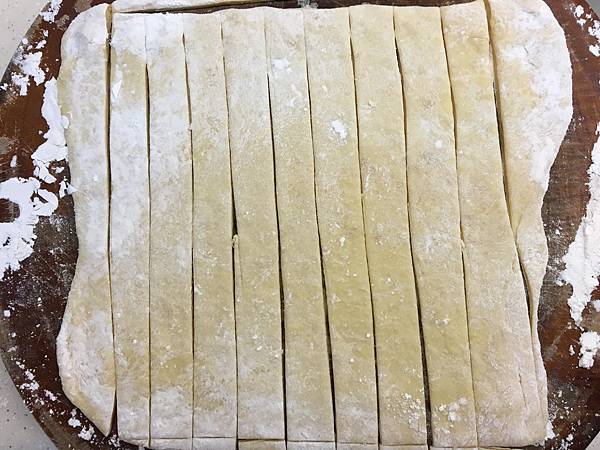 砧板灑些粉,麵糰壓扁擀成方形切成條狀
