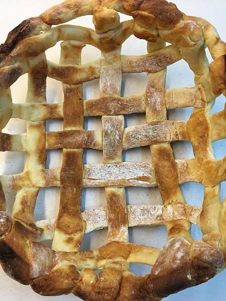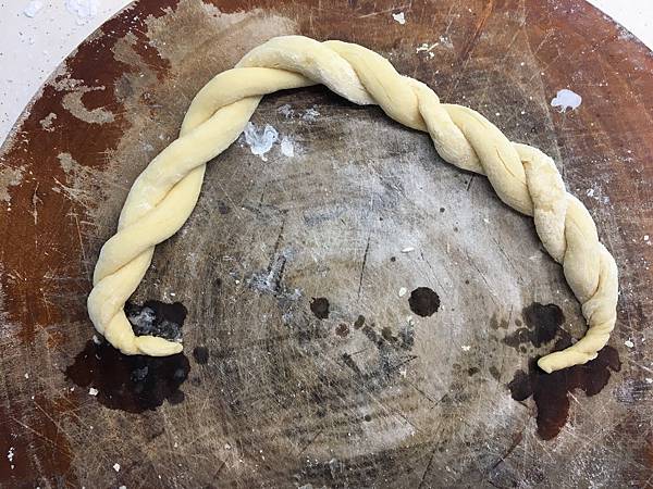 剩餘麵團編成麻花辮做成提把,進烤箱烤