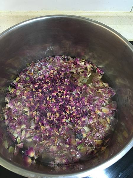 水燒開加入糖漿或砂糖攪拌均勻,熄火放進玫瑰花瓣和切薄的蘋果片