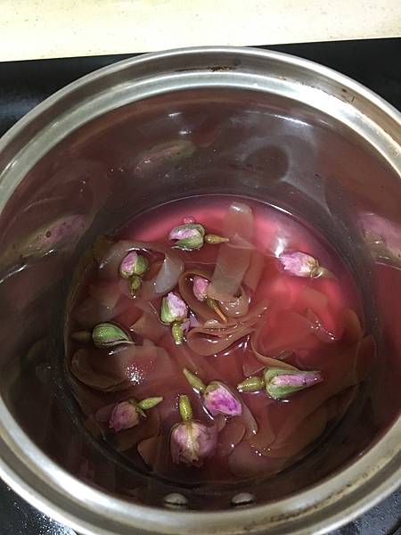 削下來的蘋果皮煮出紅色汁液,熄火加入玫瑰花增添顏色和香氣