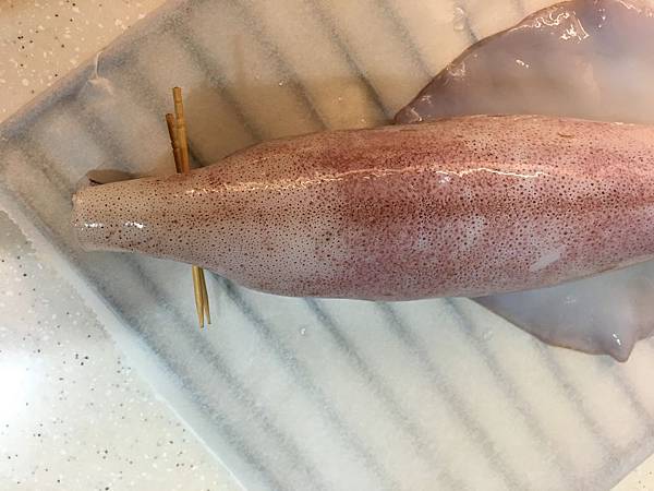內餡塞入烏賊體內,用牙籤封口進烤箱烤