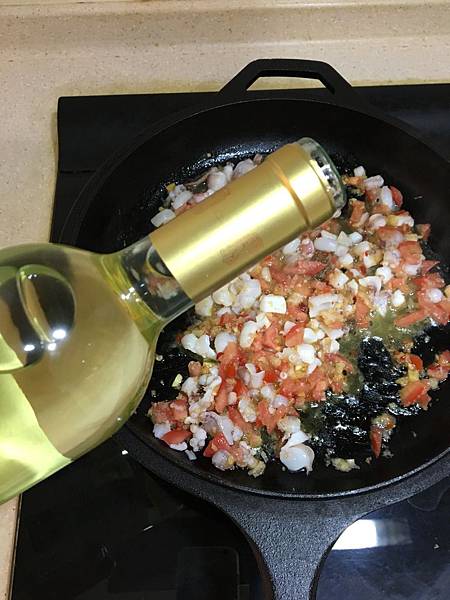 大蒜、辣椒切碎炒香,加入烏賊、鯷魚、番茄丁、白酒燉煮