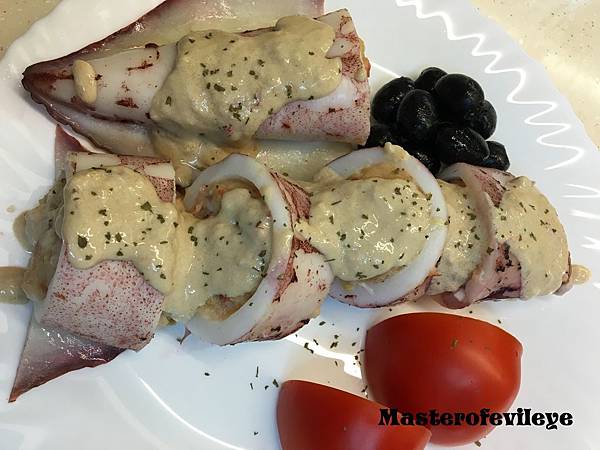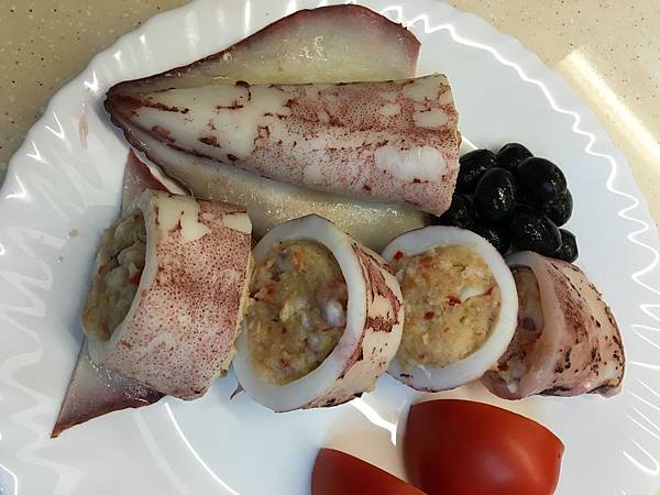 這道料理的缺點就是味道太重了,連配菜的番茄的酸味都被壓過了,黑橄欖也是鹹的,為了能讓舌頭適度的休息只好紅酒一杯接一杯,飲酒過量有害健康啊