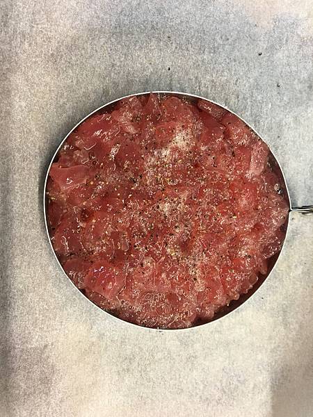 鮪魚切碎混和蛋白檸檬汁、黑胡椒、鹽,塑成圓形肉排